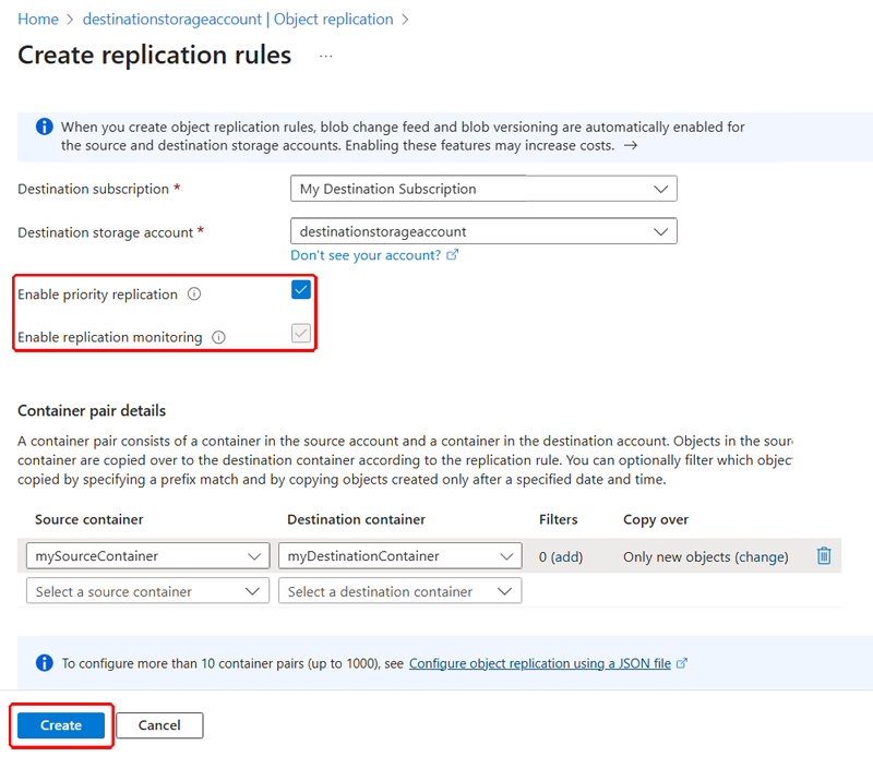 Create your container pair by selecting the Source container and Destination container values from the dropdown menus. Finally, select Create to add the new OR policy with priority replication enabled.