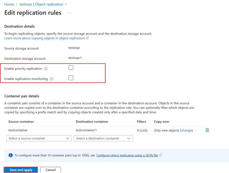 Although a storage account can have up to two object replication policies, priority replication can only be enabled on one object replication policy per source storage account. Users should plan accordingly when deciding to opt out of Priority replication, especially if the feature was enabled for critical workloads.