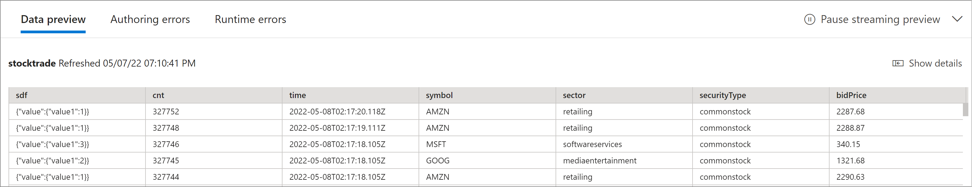 - A sample of your input data in the bottom pane under Data preview that automatically refreshes periodically. You can select Pause streaming preview if you prefer to have a static view of your sample input data.