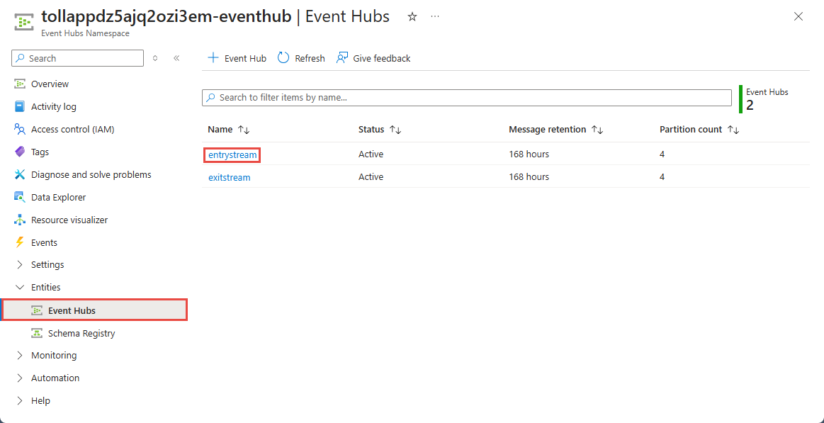 On the Event Hubs Namespace page, select Event Hubs under Entities on the left menu.