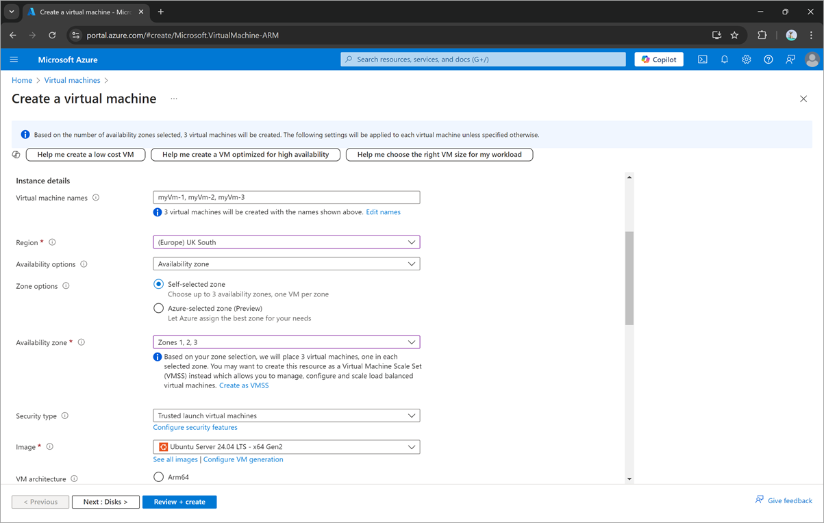 • For regions that support availability zones, Premium SSD v2 disks can only be attached to zonal VMs. When creating a new VM, specify the availability zone you want before adding Premium SSD v2 disks to your configuration.