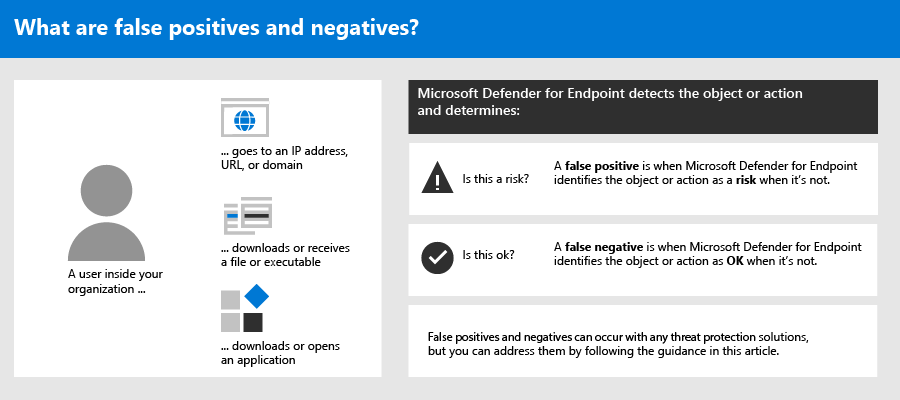 In endpoint protection solutions, a false positive is an entity, such as a file or a process that was detected and identified as malicious even though the entity isn't actually a threat. A false negative is an entity that wasn't detected as a threat, even though it actually is malicious. False positives/negatives can occur with any threat protection solution, including Defender for Endpoint.
