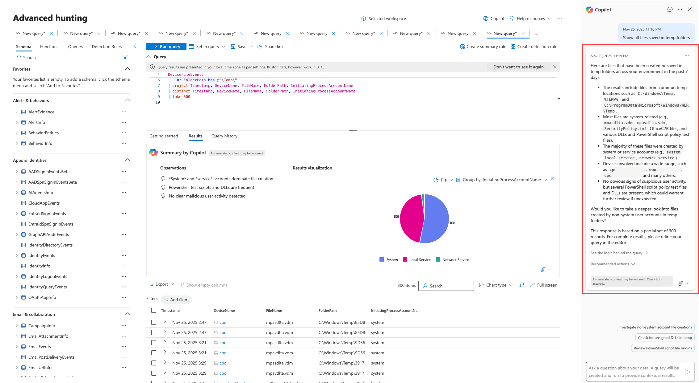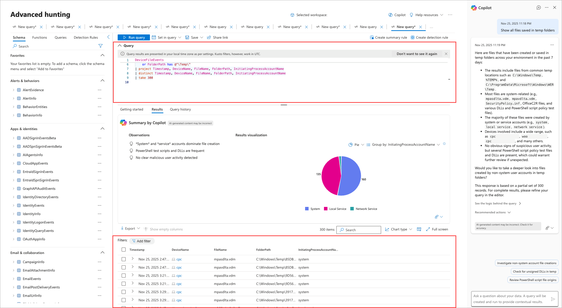 KQL query and results: The underlying KQL query is generated and run automatically, with the results displayed in the advanced hunting results pane and seamlessly integrated into the experience.