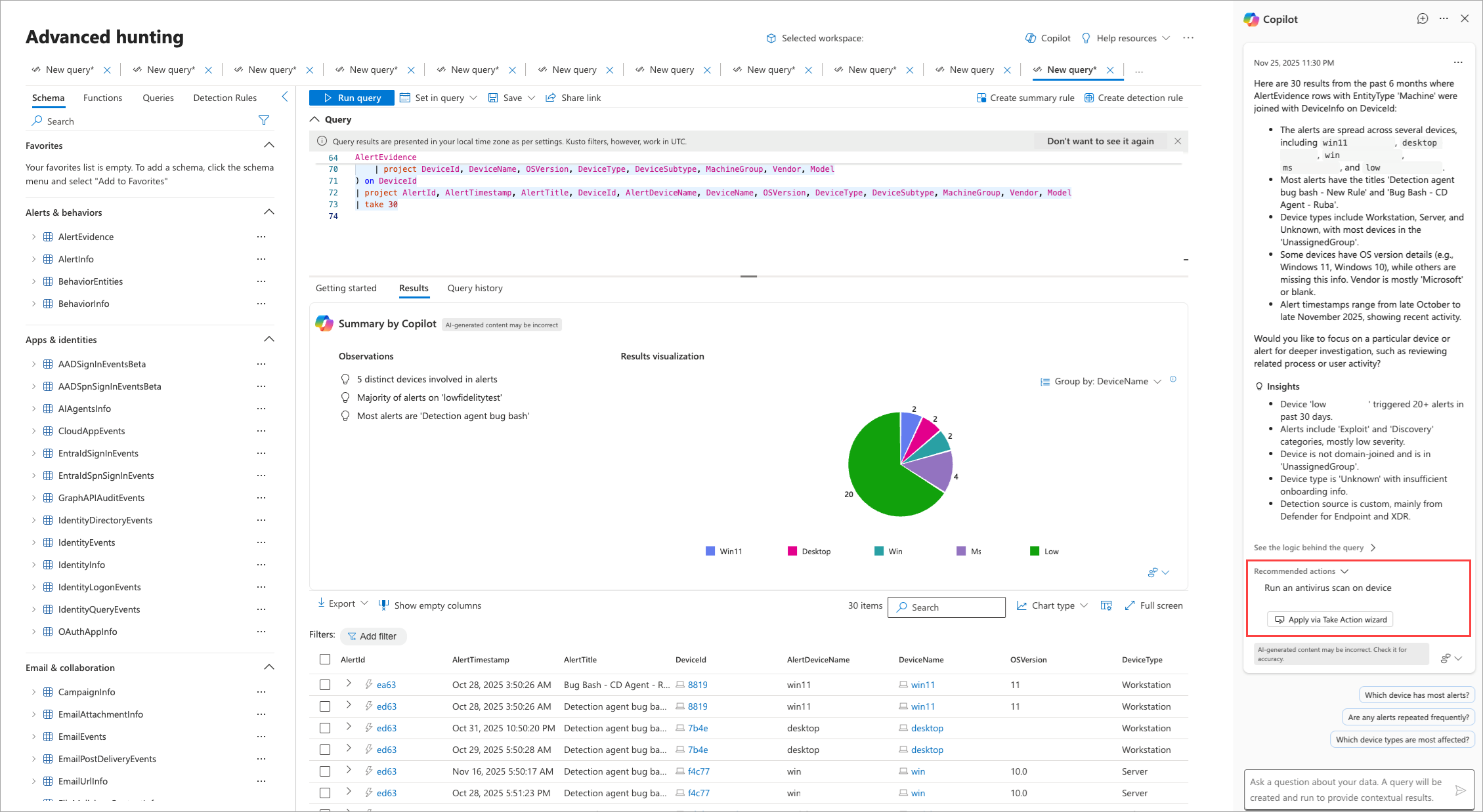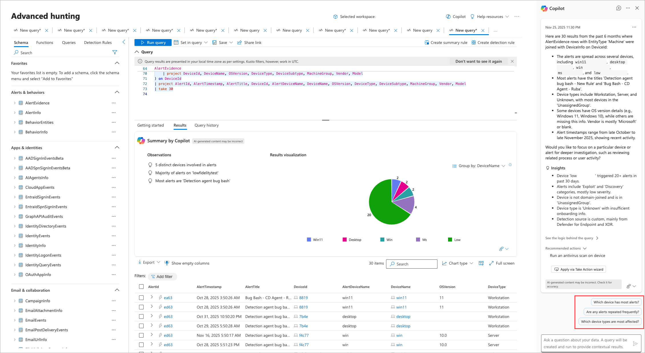 - Use advanced hunting features: Save your query, export results, create a detection rule, or use any of the other advanced hunting features for the KQL query displayed in the editor and the generated results.
