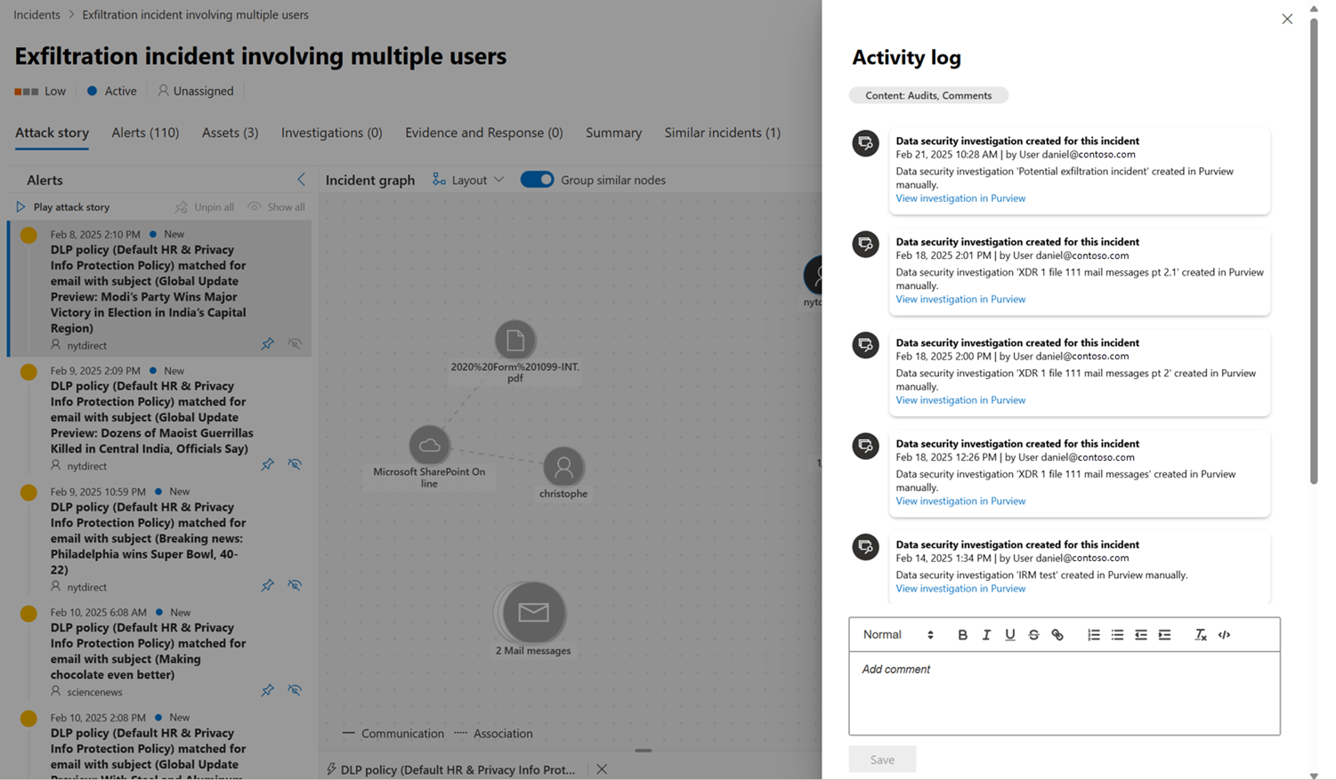 You can now start an investigation on data security incidents from the Microsoft Defender portal with the integration of Microsoft Purview Data Security Investigations (preview) and Microsoft Defender XDR.