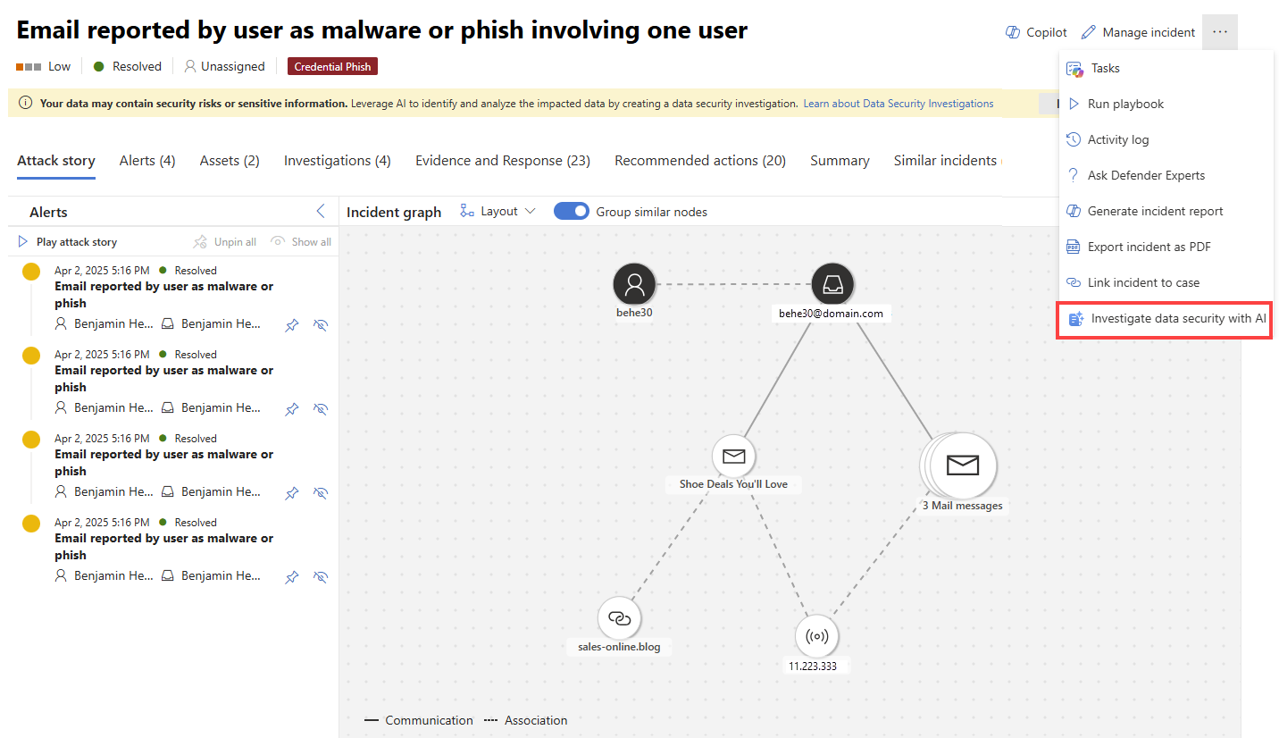 From the Incidents page, select the More actions ellipsis to see the options, then choose Investigate data security with AI.