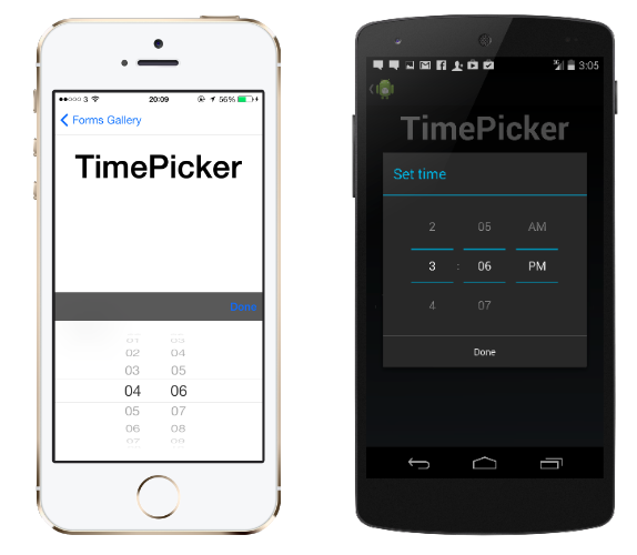 The visual representation of a TimePicker is very similar to the one of Entry, except that a special control for picking a time appears in place of a keyboard.