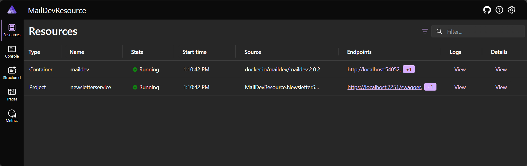 Now that you've created the MailKit client integration and updated the Newsletter service to use it, you can run the sample. From your IDE, select F5 or run dotnet run from the root directory of the solution to start the application—you should see the Aspire dashboard: