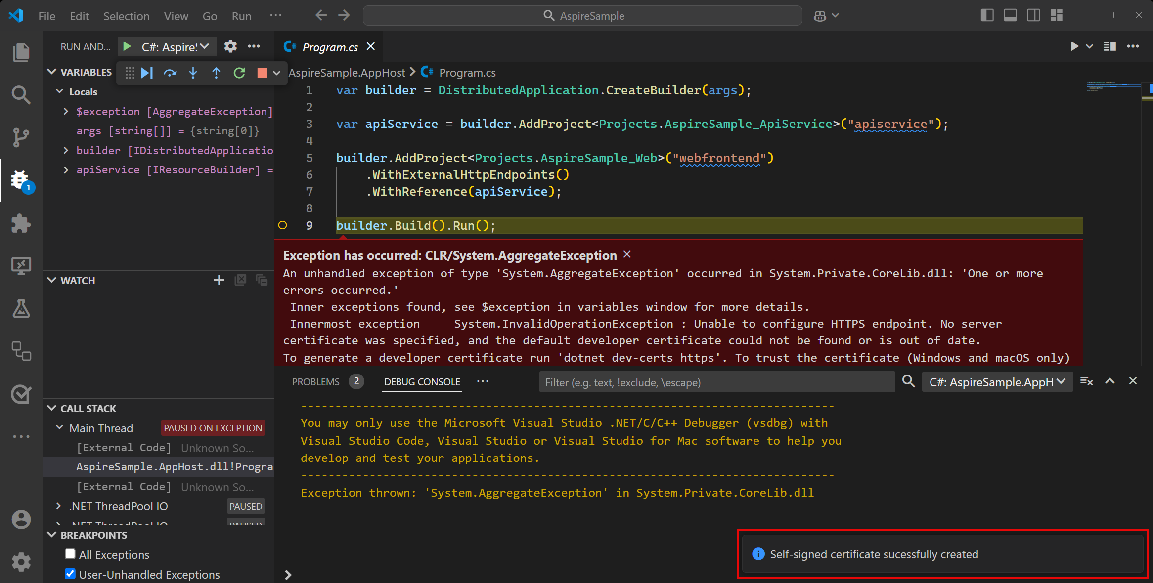 If this is the first time you're running Aspire, or it's a new machine with a new .NET installation, you're prompted to install a self-signed localhost certificateβand the project will fail to launch: