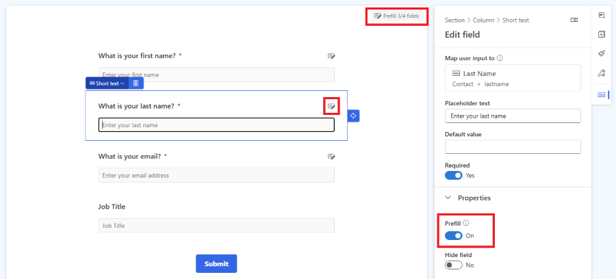 Open the form editor and enable form prefill in the form settings. When you enable form prefill, all fields in that form are prefilled. You can also enable or disable prefill for a specific field in the field's properties. The form editor shows which fields are prefilled with an icon and displays the total count of prefilled fields.