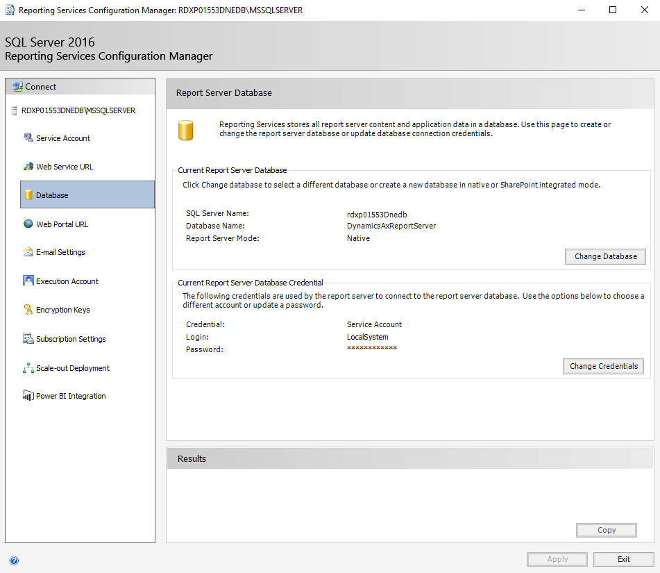 You will need to create a new database. To do this, click Change Database, and then verify that the new database name is: DynamicsAxReportServer.