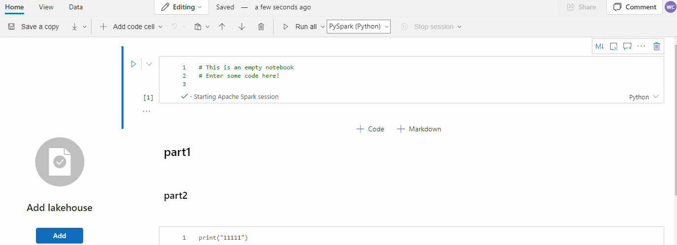 Similar to Jupyter Notebooks, Fabric notebooks have a modal user interface. The keyboard does different things depending on which mode the notebook cell is in. Fabric notebooks support the following two modes for a given code cell: Command mode and Edit mode.