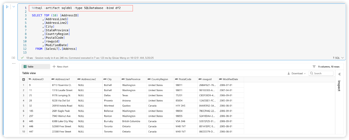 %%tsqlmagic command, include the parameter-sessionto establish the connection context. For example:%%tsql -artifact ContosoDWH -type Warehouse -session SELECT TOP(10) * FROM [ContosoDWH].[dbo].[Geography];Use line magic: After initializing the session, you can use