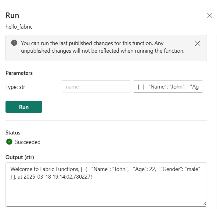 hello_fabricfunction is published, you can run it from the list of functions in the Functions explorer.