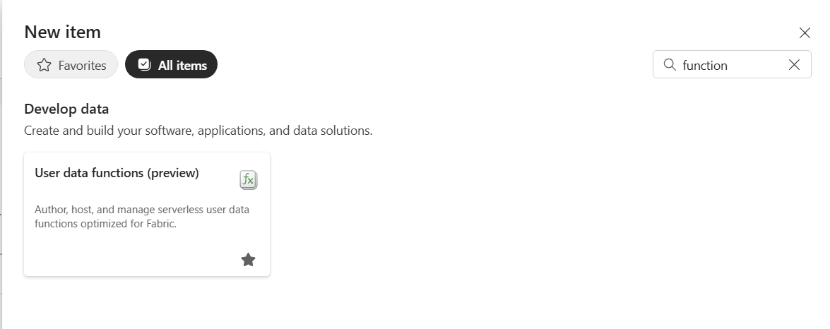 In this guide, we will create a new User Data Functions item and write new functions in it. Each User Data Functions item contains code that defines one or many functions that you can run individually.