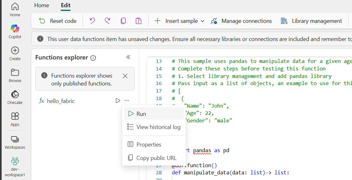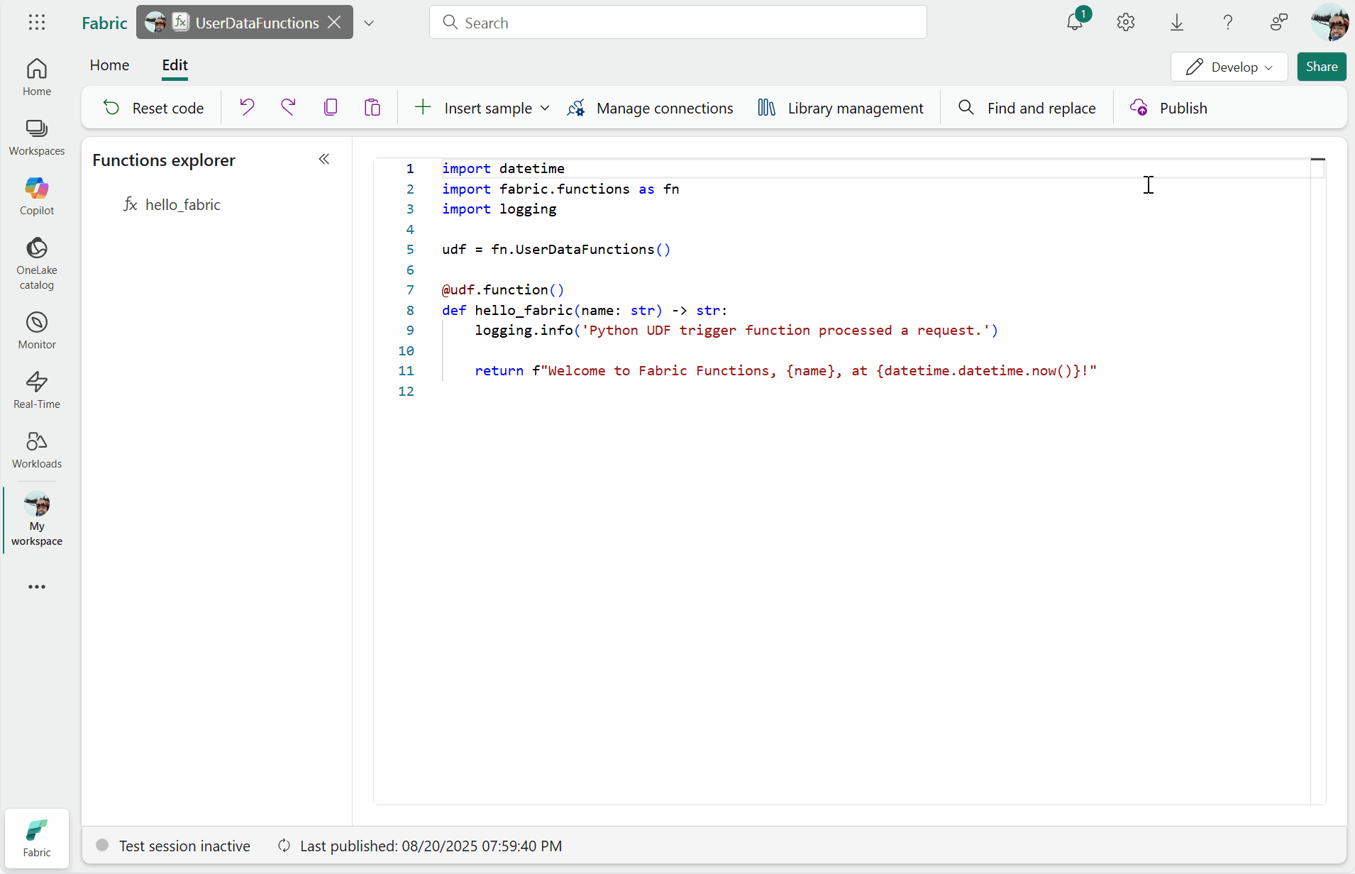 hello_fabricPython function template. The Functions explorer shows all the functions that are published and ready to be invoked.Once the