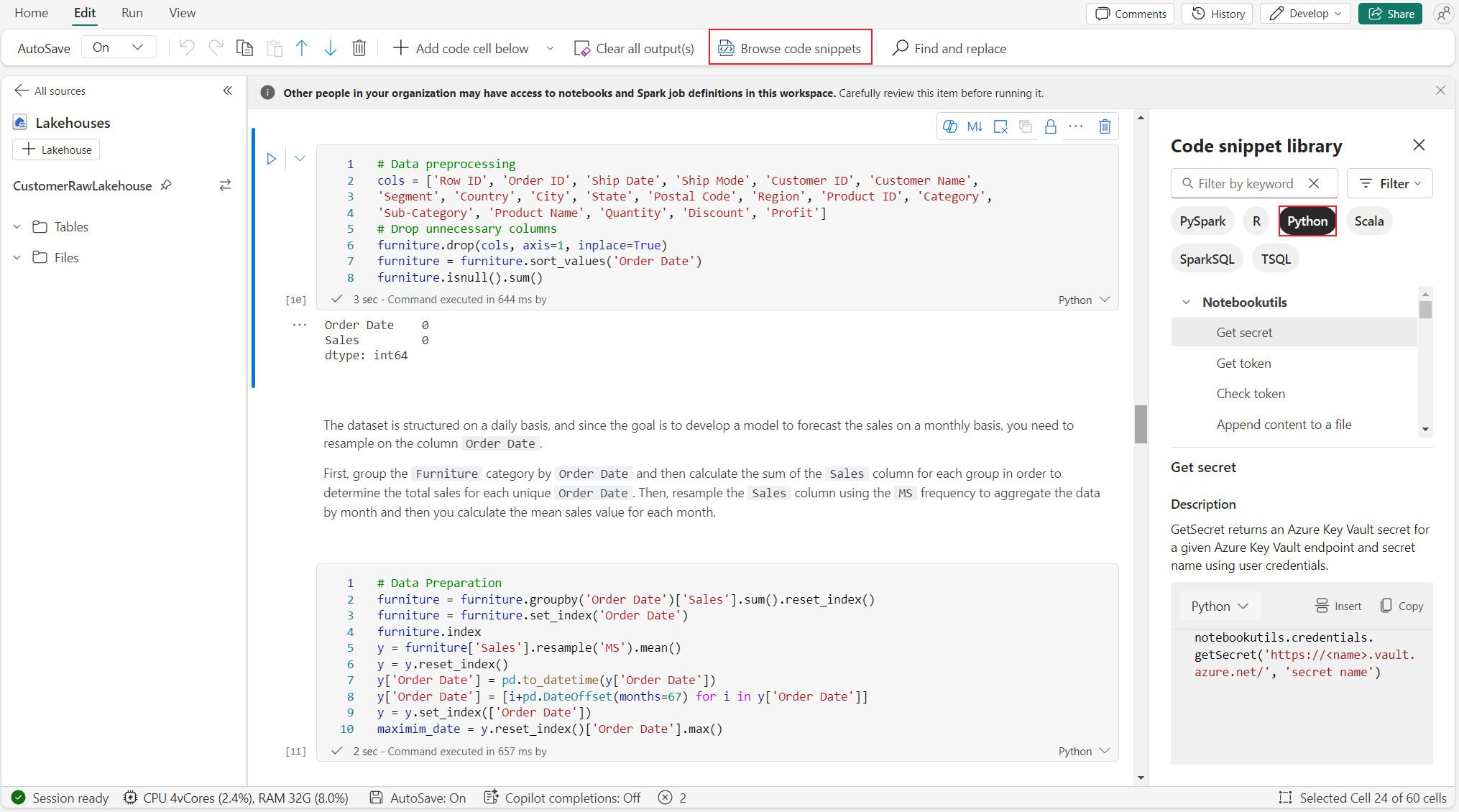 • Lakehouse & Resources are natively available: The Fabric Lakehouse together with Notebook built-in Resources full functionality are available in Python notebook. This feature enables users to easily bring the data to python notebook, just try drag & drop to get the code snippet.