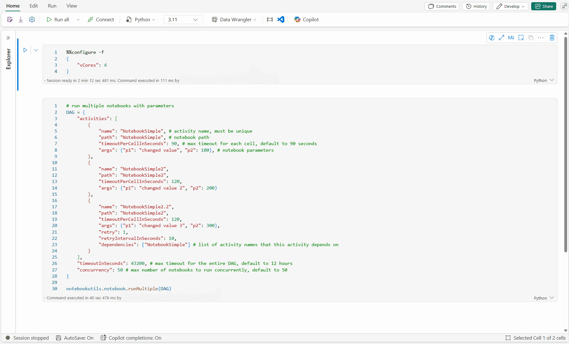 • Reference run: You can use notebookutils.notebook.run() or notebookutils.notebook.runMultiple() to reference run Python notebooks in another Python notebook as batch job. Snapshot will be generated after the reference run finished.