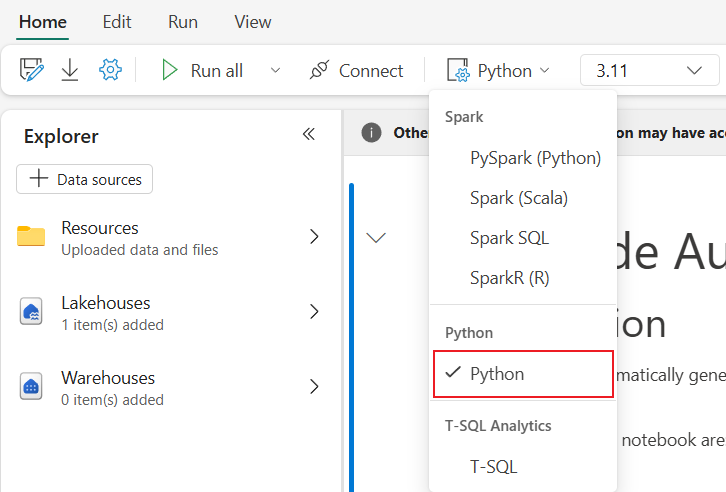 • Multiple built-in python kernels: Python notebooks offer a pure Python coding environment without Spark, with two versions of Python kernel - Python 3.10 and 3.11 available by default, and the native ipython features supported such as iPyWidget, magic commands.