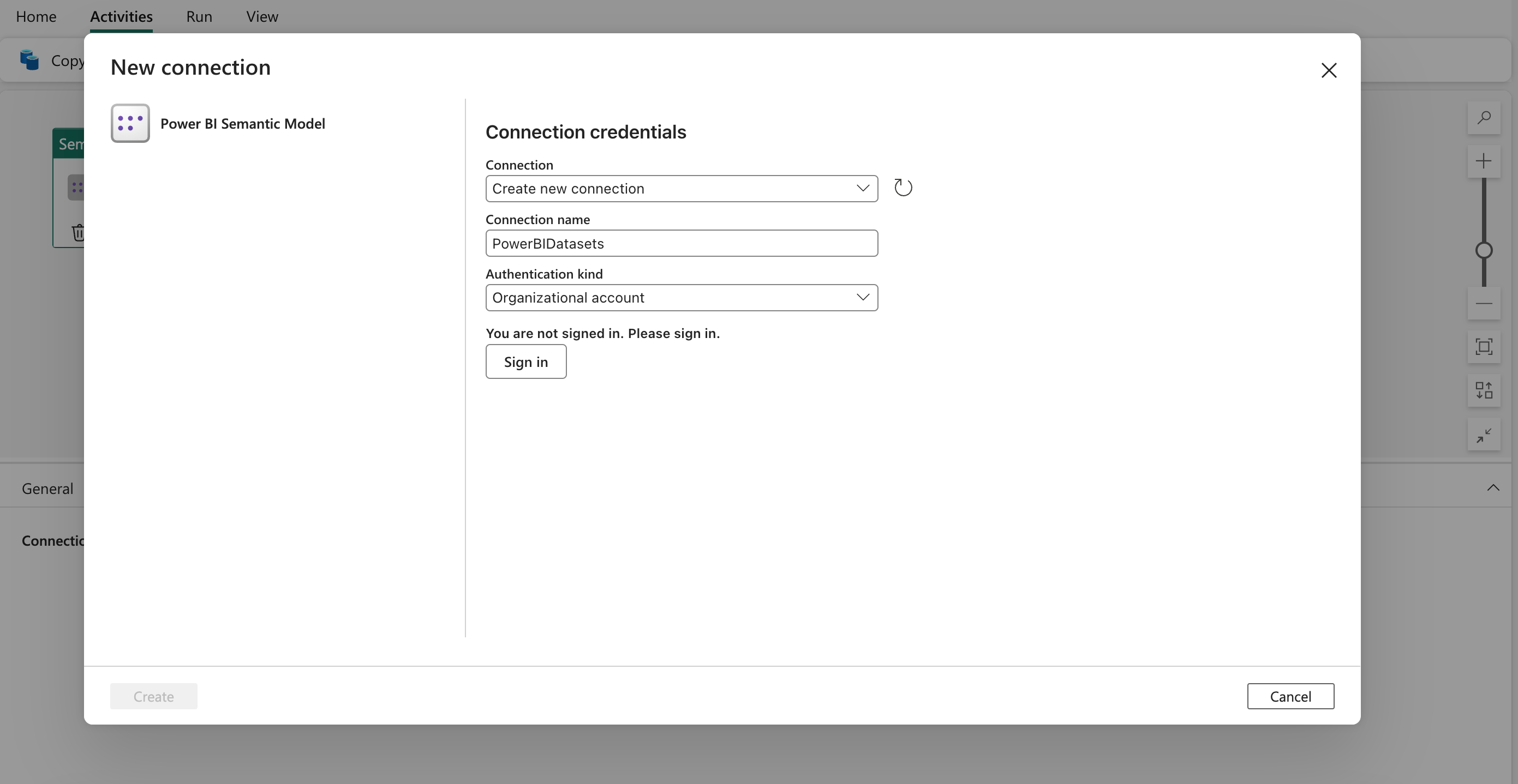 Before you add the Semantic model refresh activity, make sure you have a connection to your Power BI datasets.