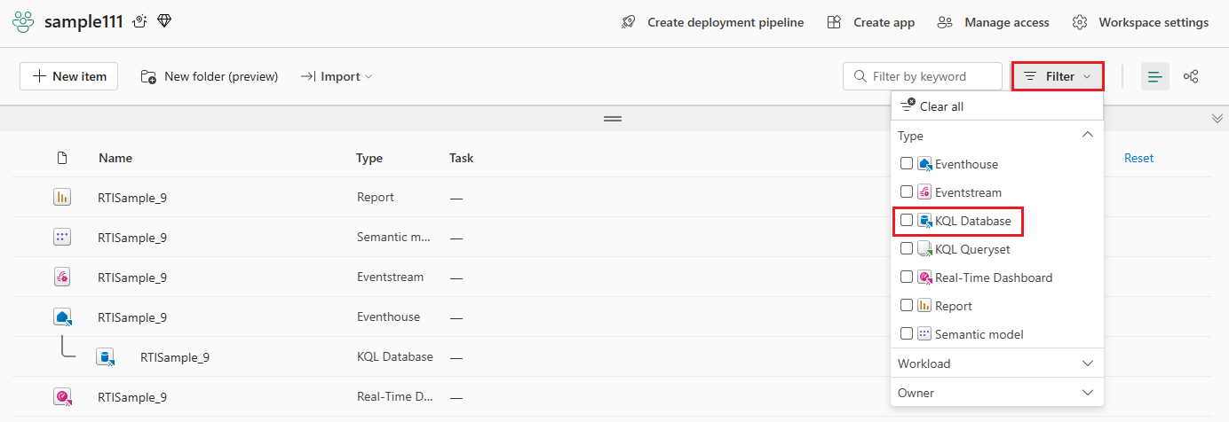 Screenshot of workspace window that shows the dropdown menu of the Filter option. The entry titled KQL Database is highlighted.