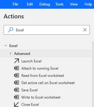 Application or file-specific Power Automate for desktop actions. For example, for Excel, PDF, and file/folder.