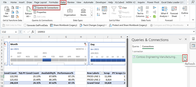 Select the Data tab in Excel, select Refresh All > Refresh.