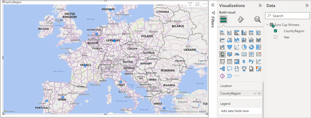 The map shows identical data points for every country/region that won a Euro Cup tournament. To make the size of each data point reflect how often the country/region has won, drag the Year field to Add data fields here under Bubble size in the lower part of the Visualizations pane. The field automatically changes to a Count of Year measure, and the map visualization now shows larger data points for countries/regions that have won more tournaments.