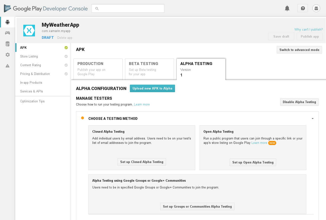 The first time an APK is submitted to Google Play (or if an early version of Xamarin.Android is used) the APK must be manually uploaded through the Google Play Developer Console. This guide explains the steps required for this process.