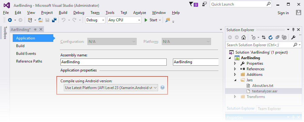 6. Open the project Properties to configure the Target Framework. If the .AAR uses any Android APIs, set the Target Framework to the API level that the .AAR expects. (For more information about the Target Framework setting and Android API levels in general, see Understanding Android API Levels.)