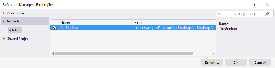 3. Select the AarBinding project created earlier and click OK: