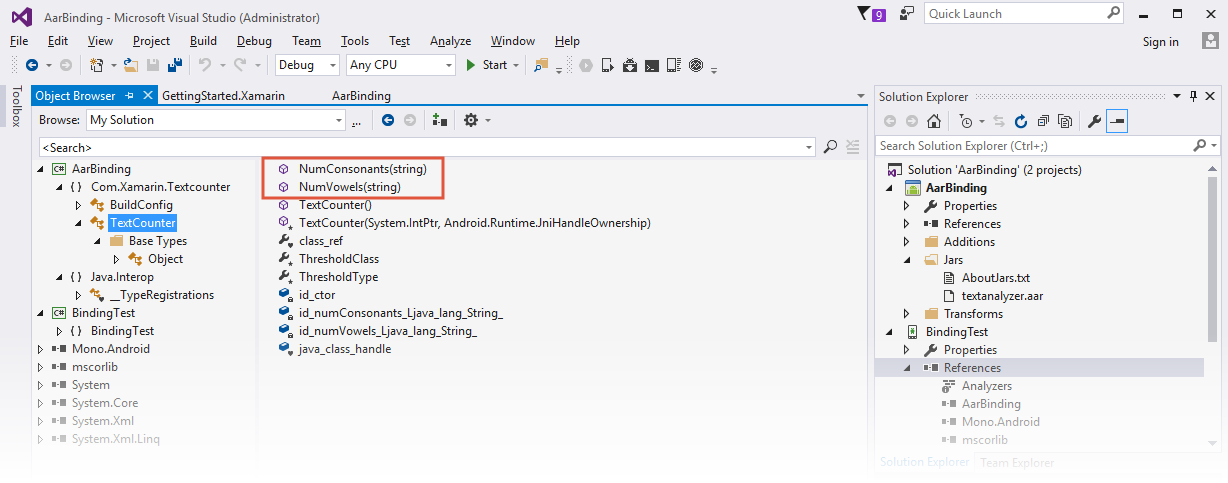 If you would like to view the contents of the Binding Library project, you can double-click the reference to open it in the Object Browser. You can see the mapped contents of the Com.Xamarin.Textcounter namespace (mapped from the Java com.xamarin.textanalyzezr package) and you can view the members of the TextCounter class: