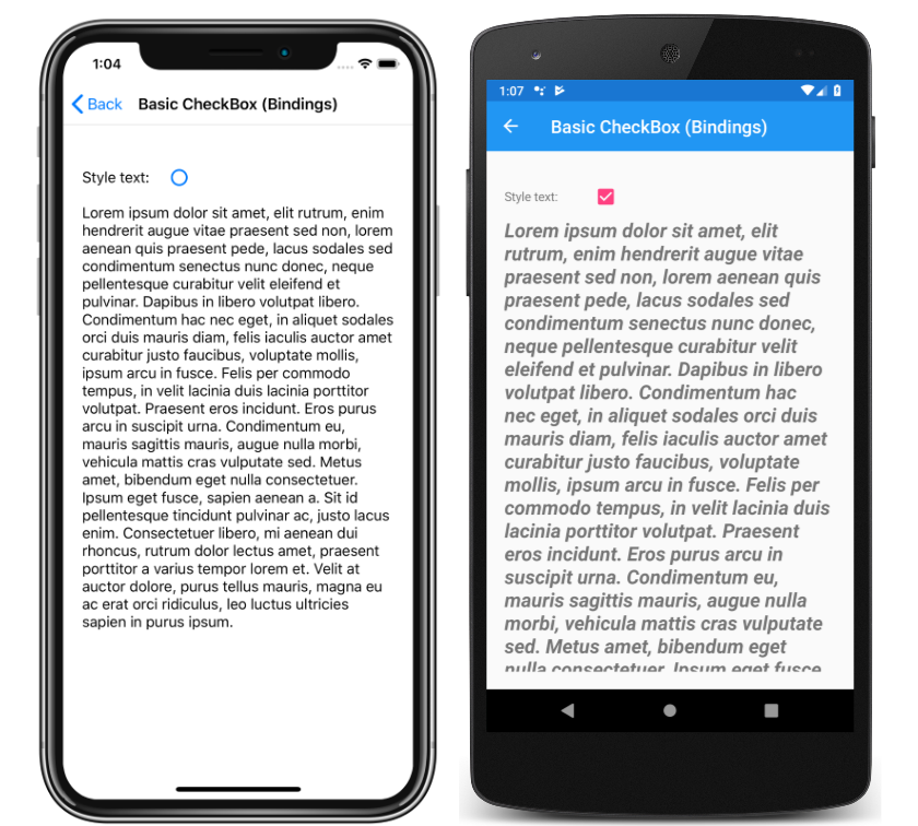 In the following screenshots, the iOS screenshot shows the Label formatting when the CheckBox is empty, while the Android screenshot shows the Label formatting when the CheckBox is checked: