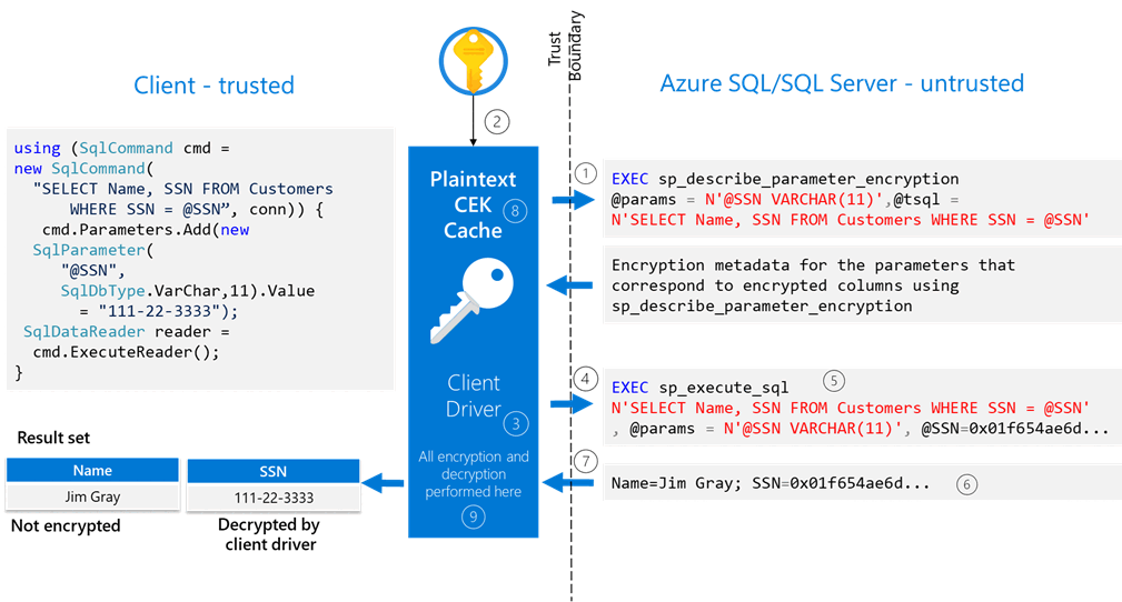 - For each encrypted column in the received result set, the driver first tries to find the plaintext column encryption key in the local cache, and only makes a round trip to a key store holding the column master key if it can't find the key in the cache.