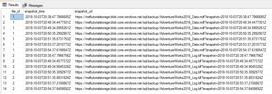 6. Review the output of the second script and notice that each time the BACKUP LOG statement is executed that two new file snapshots are created, one file snapshot of the log file and one file snapshot of the data file - for a total of two file snapshots for each database file. After the second script completes, notice that there are now a total of 16 file snapshots, 8 for each database file - one from the BACKUP DATABASE statement and one for each execution of the BACKUP LOG statement.