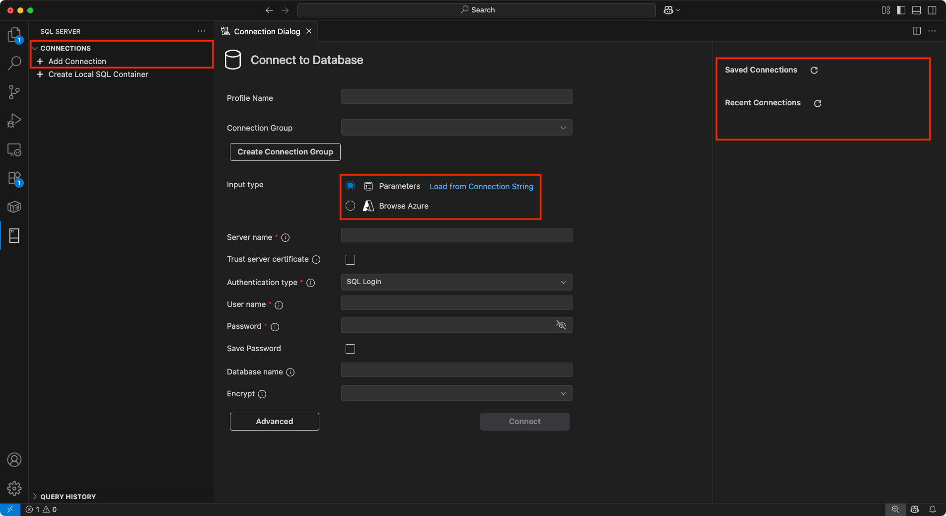 This article uses the Parameter input type and SQL Login for the authentication type.