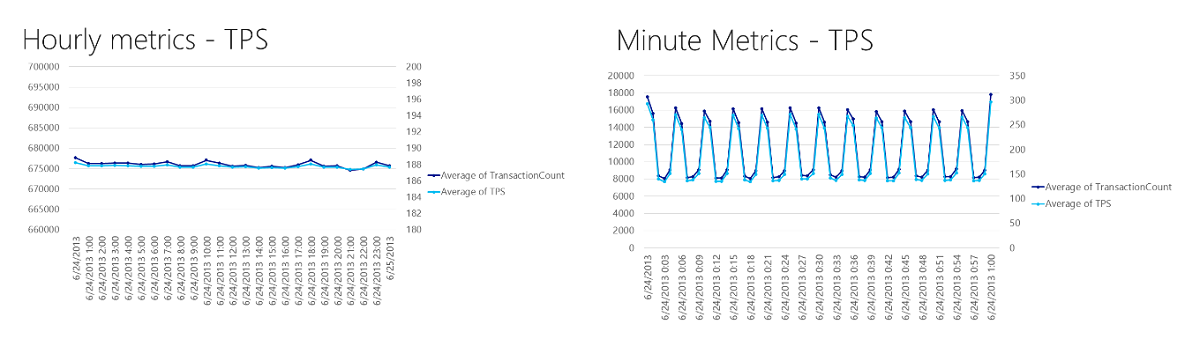 The charts in the following image illustrate how the averaging that occurs for hourly metrics can hide spikes in activity. The hourly metrics appear to show a steady rate of requests, while the minute metrics reveal the fluctuations that are really taking place.