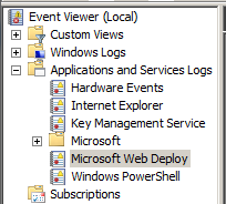 The WMSvc log shows HTTP 200 responses for these requests. Fortunately, Web Deploy 2.1 also writes information to the Microsoft Web Deploy service log. To view it, select Event Viewer (Local) > Applications and Services Logs > Microsoft Web Deploy.