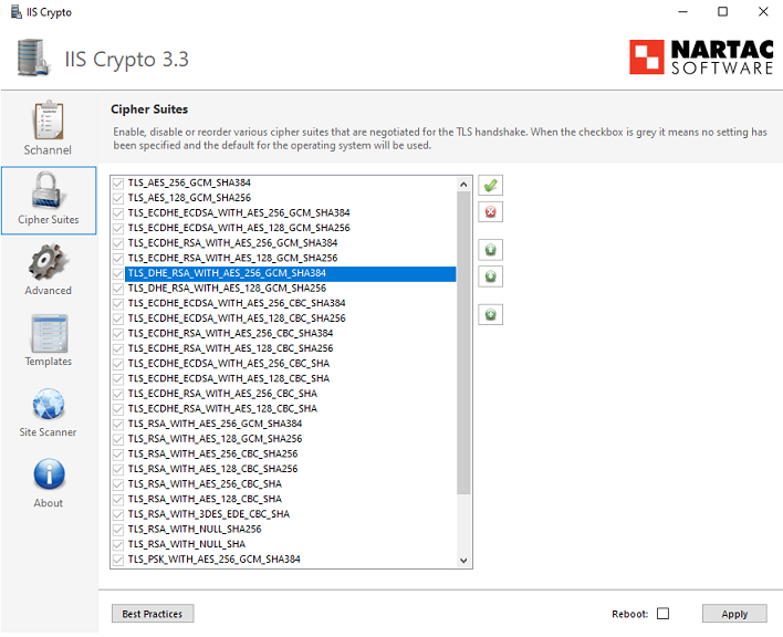 After the changes have been applied, restart the server to make sure that the new cipher suite configuration takes effect.