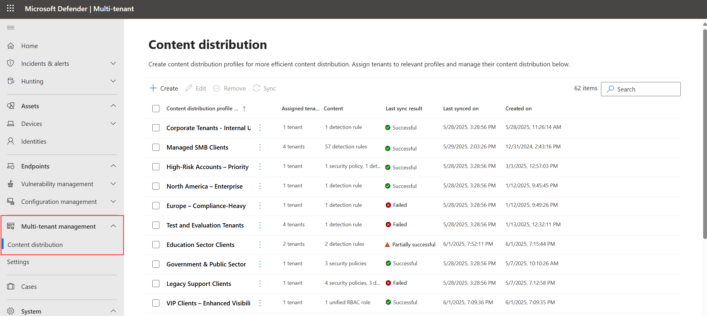 Functionality remains the same: Content distribution profiles enable you to distribute security content, including custom detection rules and endpoint security policies, at scale across all of your tenants, based on categories like business groups or location. For example: